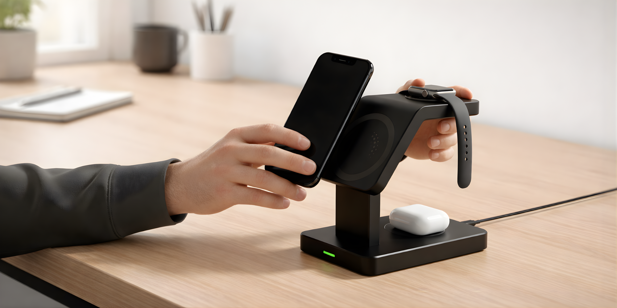 Tu peux charger simultanément ton téléphone, ta montre connectée et tes écouteurs sans fil, le tout sur la même station !